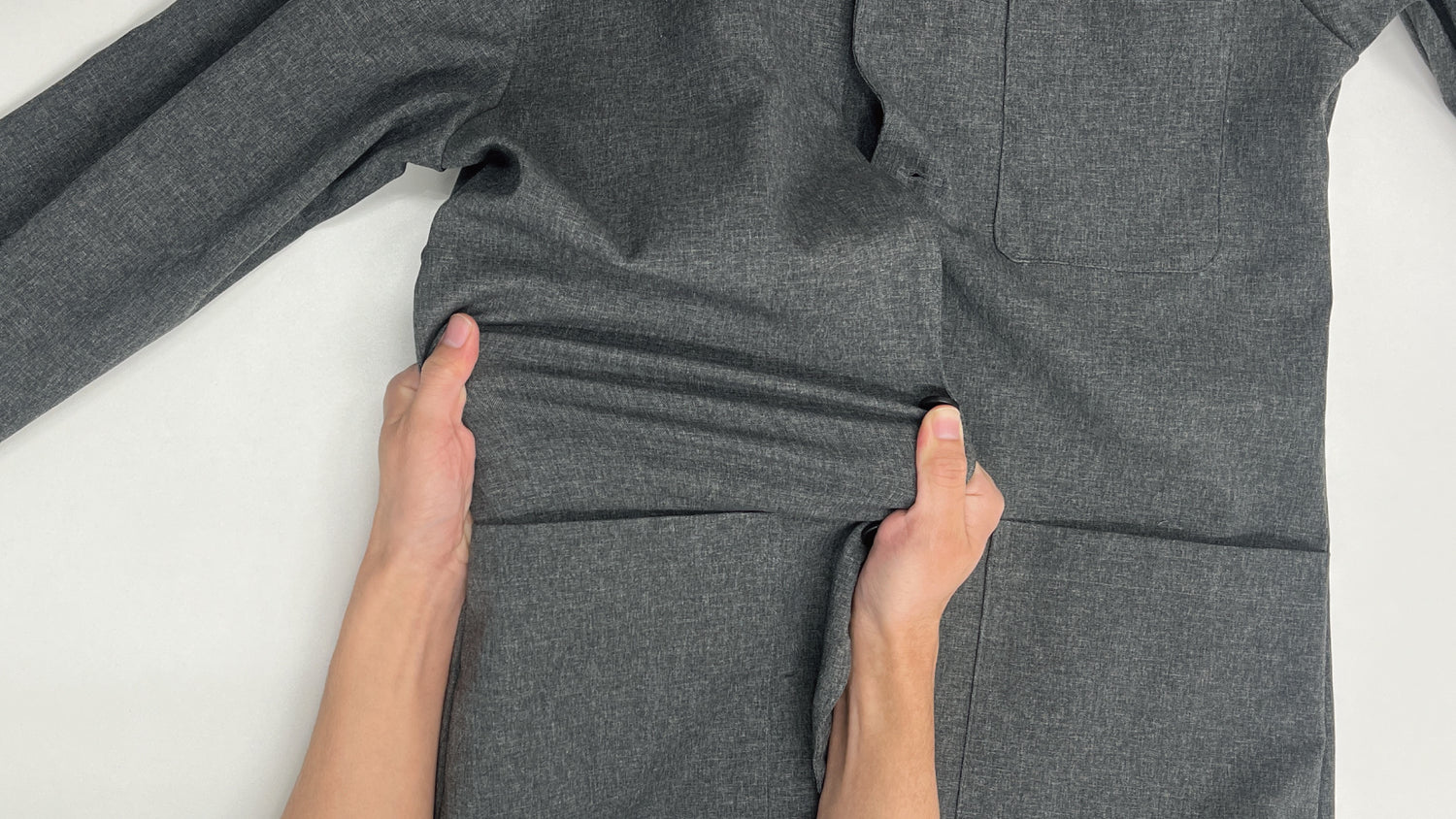 一見、ウールのような表情をしていますが、スポーツウェアと同等の機能性のある、よく伸び縮みする「ポリエステル」という素材でできています。ポリエステルの最も特徴的な点は、その「形状記憶性」です。元に戻ろうとする力があるので、気持ちよく伸び縮みしますが、形崩れがしにくいという特徴があります。