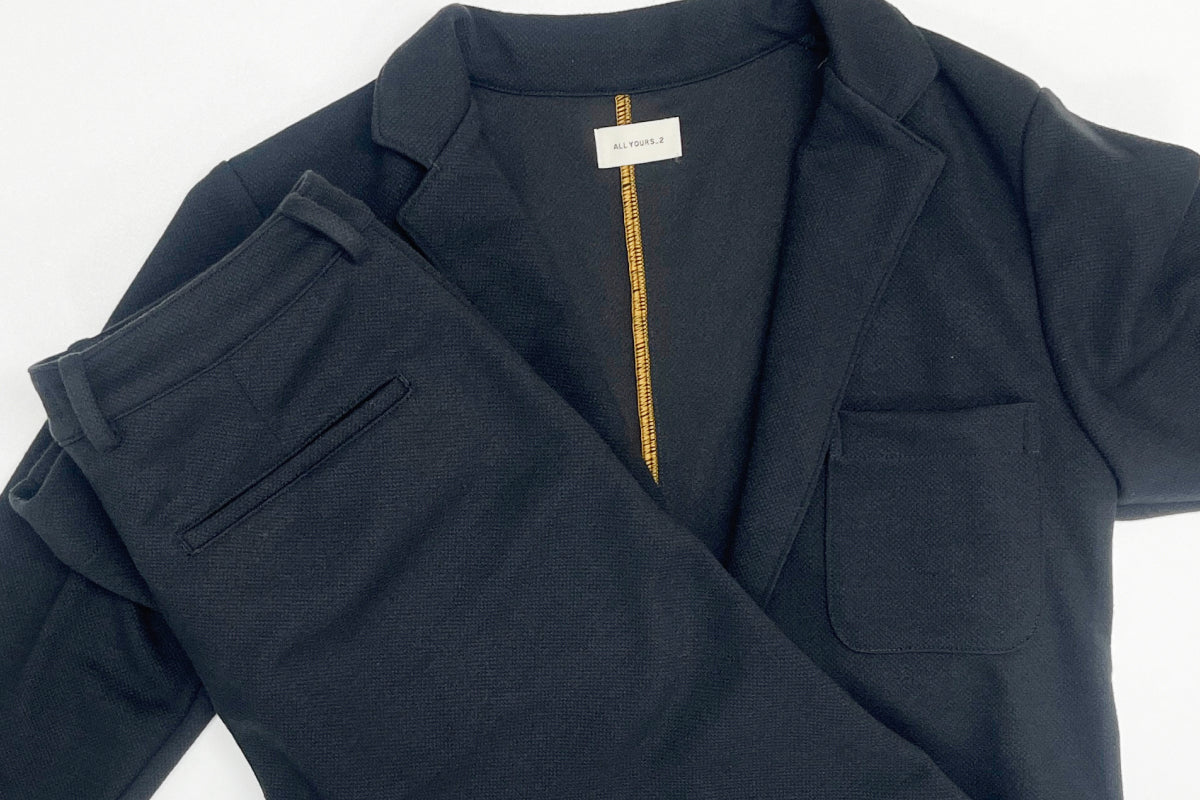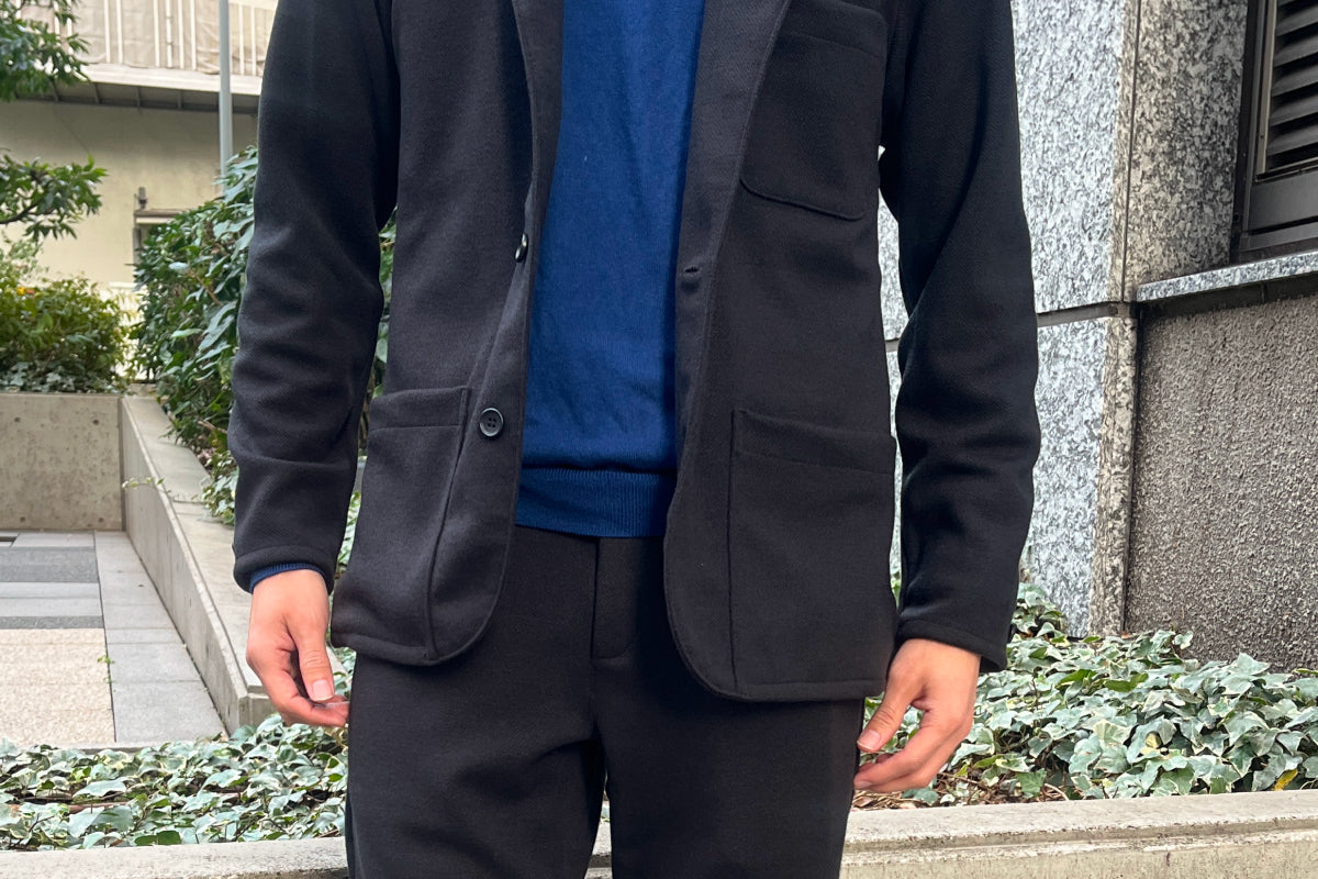 真冬でも気軽に着用でき、簡単なケアで、楽チンに着ることができるのを目標に、とにかく快適な服を「毎日着てほしい」という思いで、ブランド定番のキタキテセットアップのデザインに、みなさんが慣れ親しんだであろう「ジャージ」の生地を普段遣いできるよう原料を組み替えたニット生地をドッキングしました。