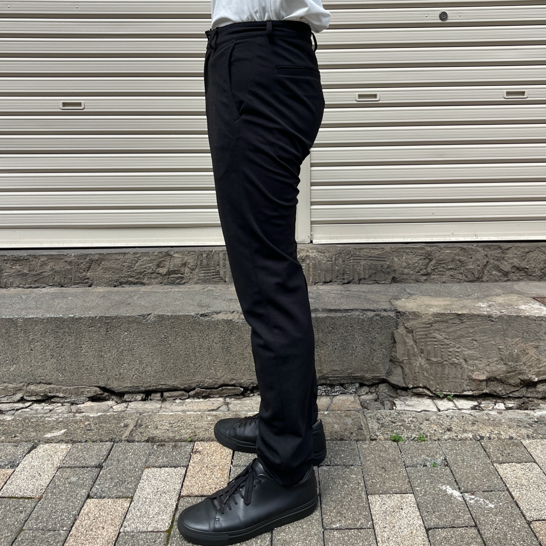 生地が柔らかいため張り付かないようヒップ・モモまわりを大きめに設定しました。デザインは「キタキテスラックス」と同一、あなたの日常に違和感なく溶け込みます。