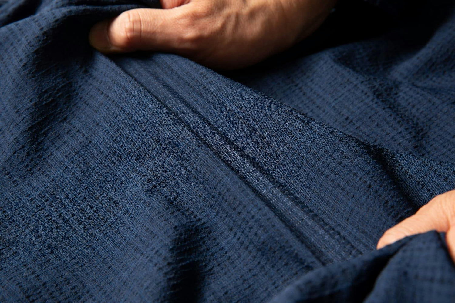 以前のアミードはシャツと同じ「織物」でしたが、今回のアミードはTシャツと同じ「編み物」となっています。もともとすきまが多い構造ですが、二重に編み込んで表はすきまを広く、裏はメッシュのように細かいすきまになるように編み分けることで透けづらいのに通気性をさらに向上させることができました。
